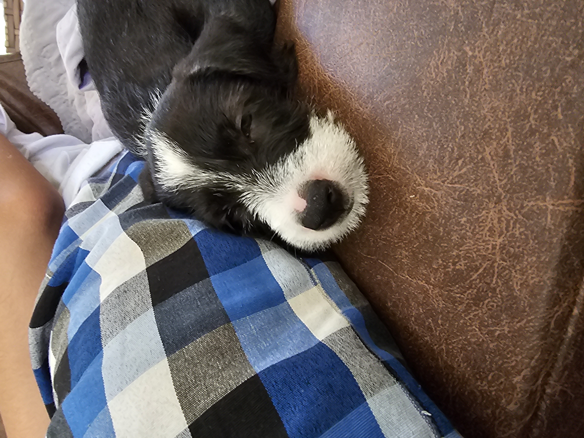 A close-up shot shows a black and white puppy sleeping on a person's lap. The person is wearing a blue, black, grey, and white plaid shirt. The puppy's face is white with a pink nose. The rest of its body is mostly black. The background includes a brown leather surface and a glimpse of a tan-skinned leg. The location is not identifiable as Cabo Frio, Brazil from this image.