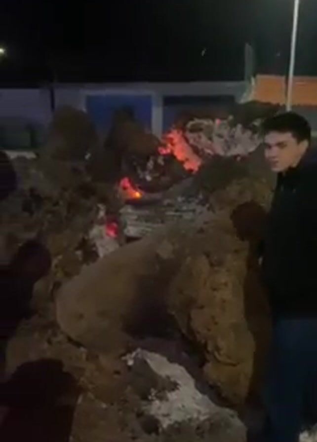 At night, the camera pans from a large pile of logs and glowing embers to a group of people standing in a paved plaza in front of a small church building decorated with strings of blue and white lights