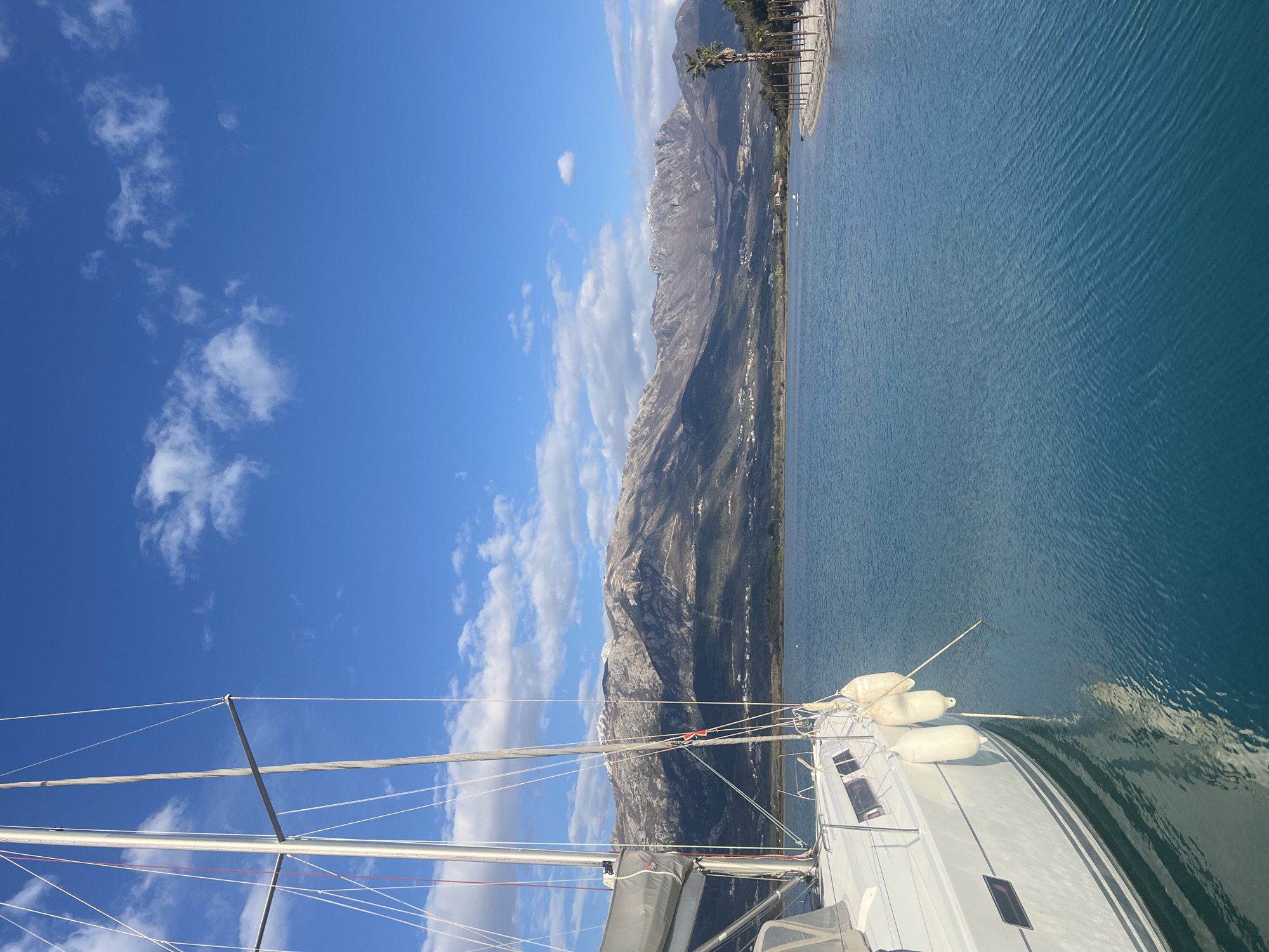 A daytime scene in Đuraševići, Montenegro, depicts a sailboat moored in a bay against a mountainous backdrop. The foreground features the port bow of a white sailboat, with its mast and associated rigging prominent on the left side of the frame. Three white cylindrical boat fenders hang along the hull, casting reflections onto the calm, turquoise-blue water. The water extends across the mid-ground, displaying subtle surface ripples. To the right, a light-colored sandy beach curves gently, lined with numerous vertical wooden posts and a singular palm tree near the water's edge. The background is dominated by a rugged mountain range, exhibiting patches of snow on its upper elevations. The lower mountain slopes show sparse vegetation and scattered structures. The sky above is clear blue with dispersed white cumulus clouds. No individuals are visible.