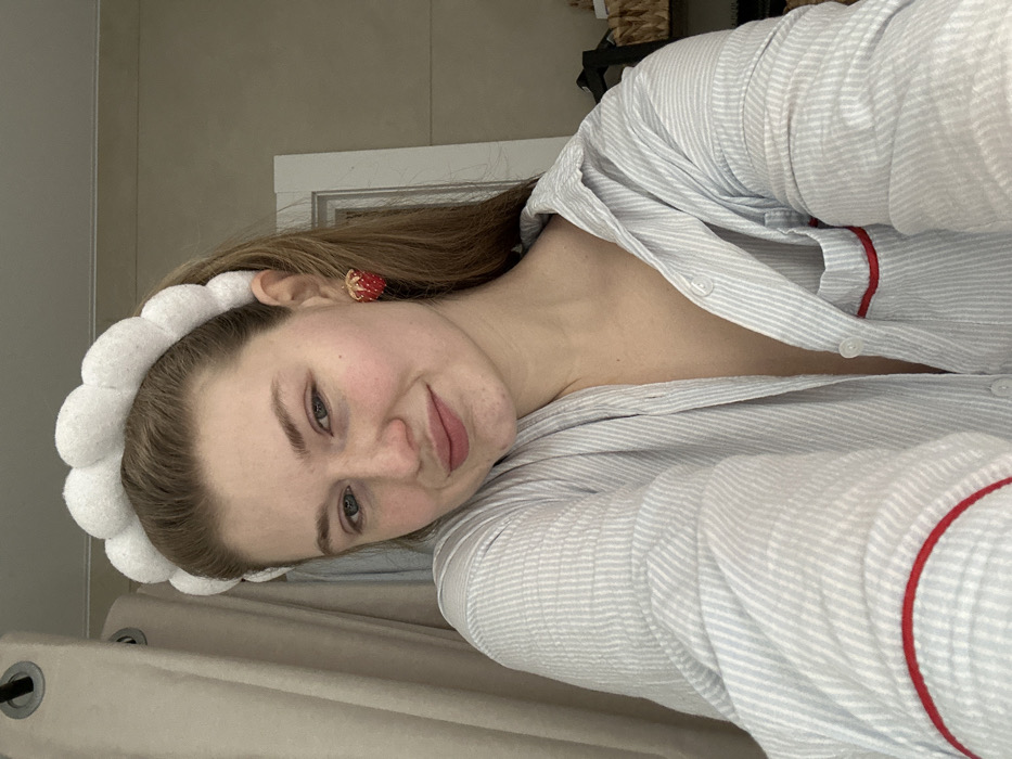 A fair-skinned woman smiles at the camera. She is wearing a blue-and-white striped pajama top with red trim. Her hair is light brown, and she wears a white, puffy headband and a red strawberry earring. The background is a neutral, beige wall. A bed or couch with a beige cover is partially visible. The lighting is soft and diffused.