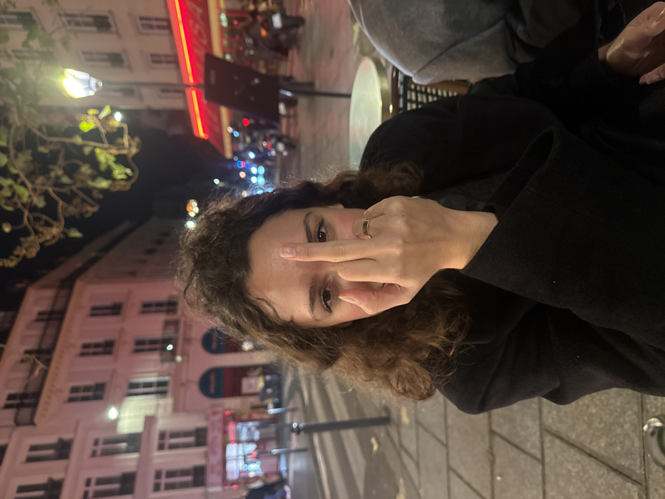 A woman seated at an outdoor café table at night gives the middle finger. She has curly brown hair and wears a black coat. A building with multiple stories and windows is visible in the background, illuminated by streetlights. A café with red lighting is also visible. Motorbikes and other people are blurred in the background, suggesting a lively city scene. Another person is partially visible, sitting with the woman.