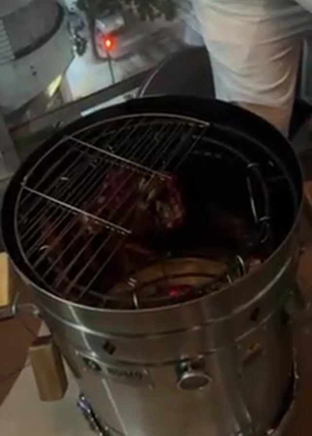 The camera shows a barbecue grill, focusing on the interior where meat is cooking over hot coals. The grill is cylindrical and made of stainless steel, bearing the brand name "HUMO." The meat appears to be marinated, as it has a deep reddish color. It sits on a metal grate. Below the grate, the coals glow red. A person is briefly visible on the right side of the frame, wearing a white shirt and a gold bracelet. Their hand reaches into the grill. The setting is outdoors at night, possibly on a balcony or patio, with a street visible in the background.