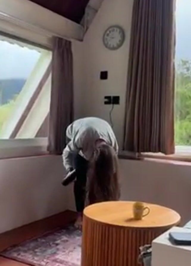 A woman in a grey sweatshirt and black leggings is bent over at the waist, drying her long, brown hair with a black hair dryer. The scene is indoors, in a room with light-colored walls, a dark wooden floor, and an angled ceiling. There is a round wooden table in the foreground with a yellow mug on it. Behind the woman, there are two windows with brown curtains, and a view of trees and hills outside. A rug lies on the floor beneath her. A clock hangs on the wall between the windows.