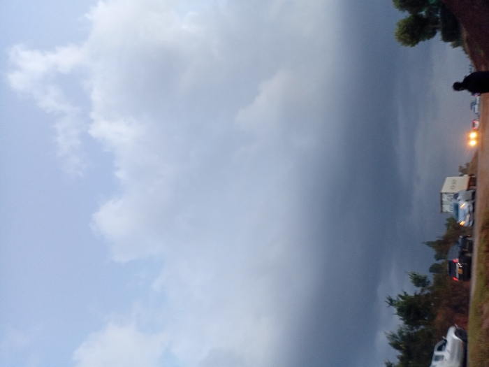 A cloudy sky with a sharp contrast between light and dark. The brighter side features scattered white clouds against a light blue backdrop, while the other displays ominous, dark gray storm clouds. A line of vehicles, including a large truck, is visible on a road next to trees. In the distance, headlights shine through the gloom. A person stands on the side of the road, silhouetted against the dark sky.
