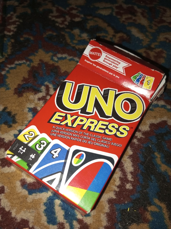 A red cardboard box of "UNO Express" game sits diagonally on a carpet
