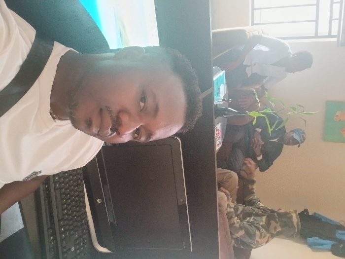The image displays an indoor scene in Nata, Botswana. In the immediate foreground, a dark-skinned male is seated, facing the camera directly. He has a short haircut, a mustache, and a short beard, and wears a white t-shirt with a dark strap over his left shoulder. To his right, a black HP computer monitor and a black keyboard are present on a dark desk. This desk acts as a partition separating the foreground subject from the background scene. In the background, a lounge area is visible with three dark-skinned males seated casually. On the left, one male is seated in a brown armchair, wearing a light-colored collared shirt and dark trousers, looking towards the center. In the middle, another male is seated in a brown armchair, wearing a dark jacket, a blue baseball cap, and dark trousers, with his hands clasped. On the right, a third male is seated, wearing a camouflage-patterned hooded jacket and light brown trousers; he appears to be extending his left hand towards the central figure. A low coffee table between the left and central figures holds a black vase with a green plant and some magazines or books. The background wall is light-colored and features a framed artwork depicting two orange shapes on a light green background. A window with dark frames on the far left allows natural light into the room. A blue jacket is visible hanging in the upper right background.