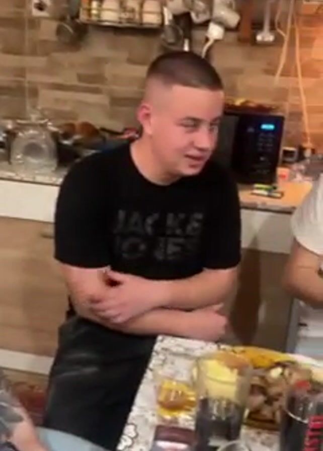 gathering of several young men, presumably in a home setting. They are seated around a table laden with food and drinks, including what appears to be meat dishes, snacks, and glasses filled with liquid. There is music playing in the background. The interior setting includes a kitchen area with cabinets and a window with blinds. The young men seem to be enjoying themselves, as some are laughing and interacting with each other, while one is holding up his phone. The overall atmosphere appears casual and social.