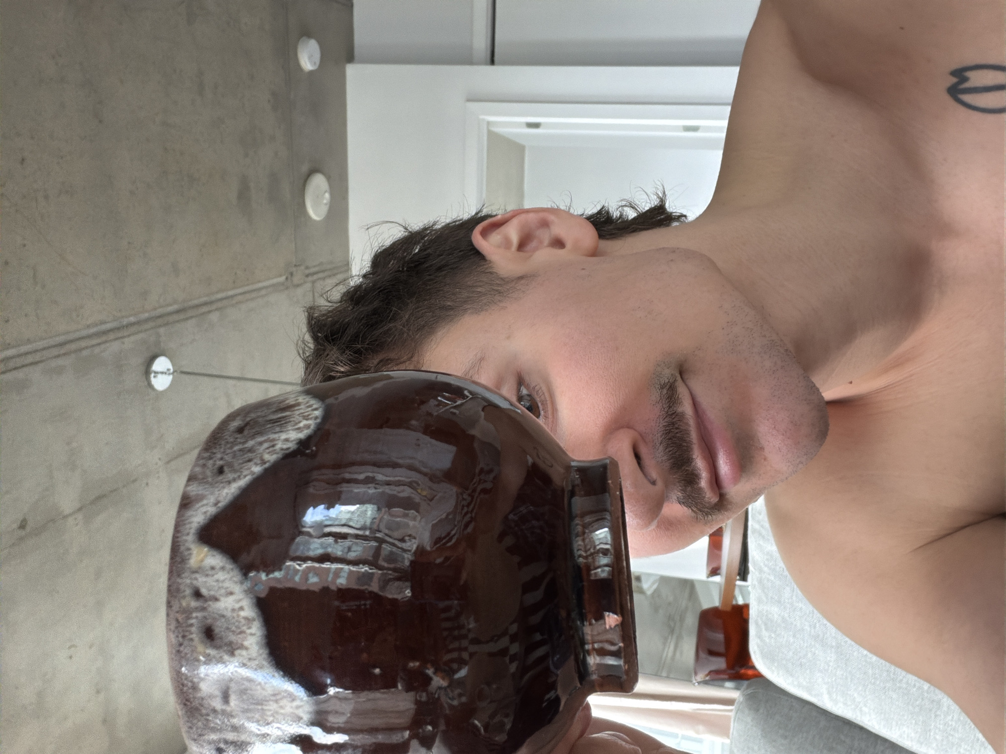 A close-up, rotated view depicts a shirtless individual with dark hair, light skin, and a faint mustache holding a brown glazed ceramic jar. A tattoo is visible on their upper right shoulder. The jar reflects surrounding light and details of the environment. The background includes a light gray concrete wall with circular fixtures and a white doorframe. The reflection in the jar suggests the scene is likely indoors, in a modern or industrial-style space. There are various red and clear glass containers that suggest a domestic environment. The location in Montreal, Canada is not discernible from the image alone.