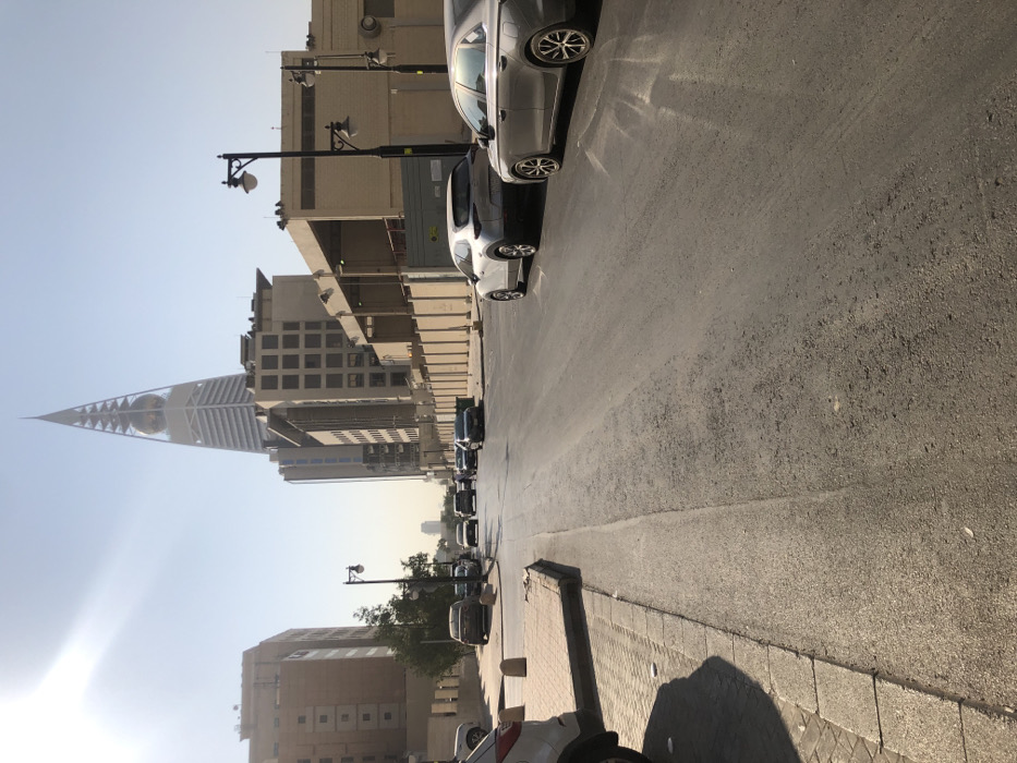 A street scene shows a line of parked cars along a sidewalk. Tall buildings are visible on the left, including a distinct pyramid-shaped skyscraper with spheres on its upper levels. Streetlights line the road. The sky is bright, and the sun is positioned low in the frame, casting long shadows on the asphalt. The image is oriented sideways.