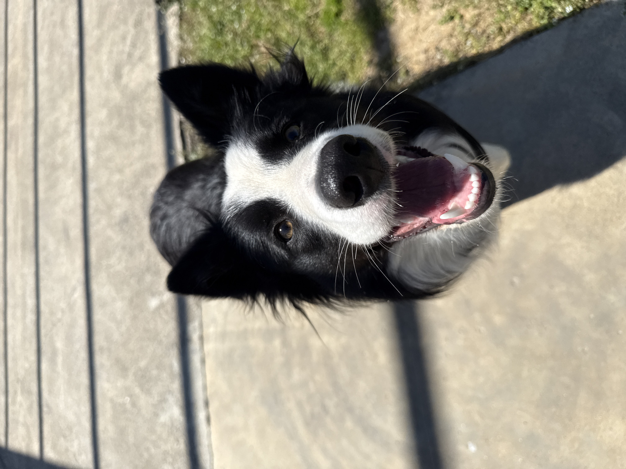 A black and white Border Collie dog is looking up at the camera with an open mouth and visible teeth