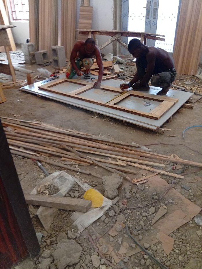 In an indoor construction or workshop environment, Unknown, Unknown, two shirtless adult males are observed crouching on a dirt and gravel floor. The male on the left, wearing patterned shorts, holds a tool in his right hand and observes the work. The male on the right, wearing dark pants, holds a tape measure in his left hand and a pencil in his right, marking a wooden component. They are positioned around a large white panel upon which a wooden frame, constructed from multiple rectangular sections, is being assembled. Numerous thin wooden planks and strips are stacked on the ground immediately in front of them. The floor is covered with scattered wood debris, small rocks, and construction materials, including a white fabric bag and a yellow scrap. In the background to the left, a window with light-colored blinds or curtains is visible, along with stacked wooden materials and concrete blocks. To the right in the background, a set of double doors, appearing to be metal or clad, is visible.