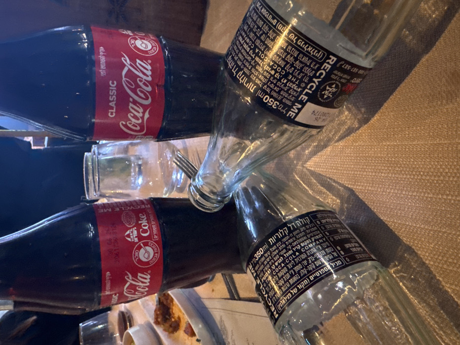 chaotic arrangement of Coca-Cola bottles. Two full glass bottles of classic Coca-Cola feature the iconic red label and white logo. Intertwined with these are two empty, clear glass Coca-Cola bottles, one displaying a black and white label with nutritional information in Hebrew and the "Recycle Me" message. A fork is visible amidst the bottles, suggesting they are on a table after a meal.
