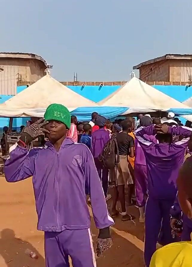 group of people, primarily children, standing in an outdoor area. They appear to be lined up or gathered near a row of white tents with blue trim. Some of the children are wearing matching purple tracksuits with the word "GUARDIANS" on the back. Others are wearing yellow shirts with the words "ST. ANTHONY" printed on them. The environment is bright, with a clear sky. There are buildings and a tall light pole visible in the background. The ground is reddish-brown, possibly dirt or gravel. The camera moves around, capturing different angles of the crowd and the surrounding area, including the shadows of the camera operator and another person.