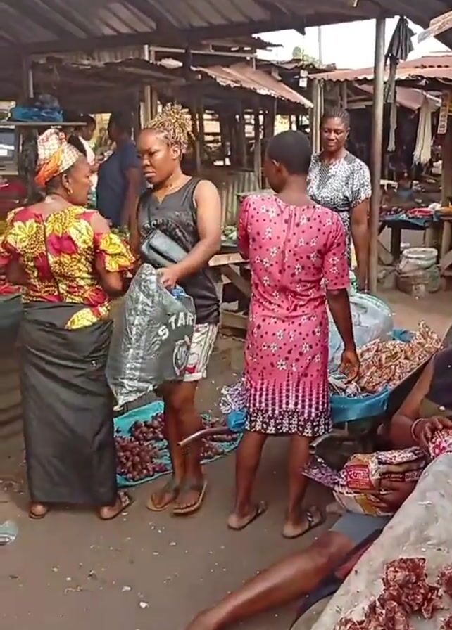 The video depicts a bustling open-air market. Several people are visible, engaged in various activities. Some are shopping, examining goods such as onions, vegetables, and what appears to be cut meat. Others are seated, seemingly selling their wares. The market is sheltered by a corrugated metal roof structure. The ground is uneven and appears to be a mix of dirt and concrete. The atmosphere seems lively and animated.