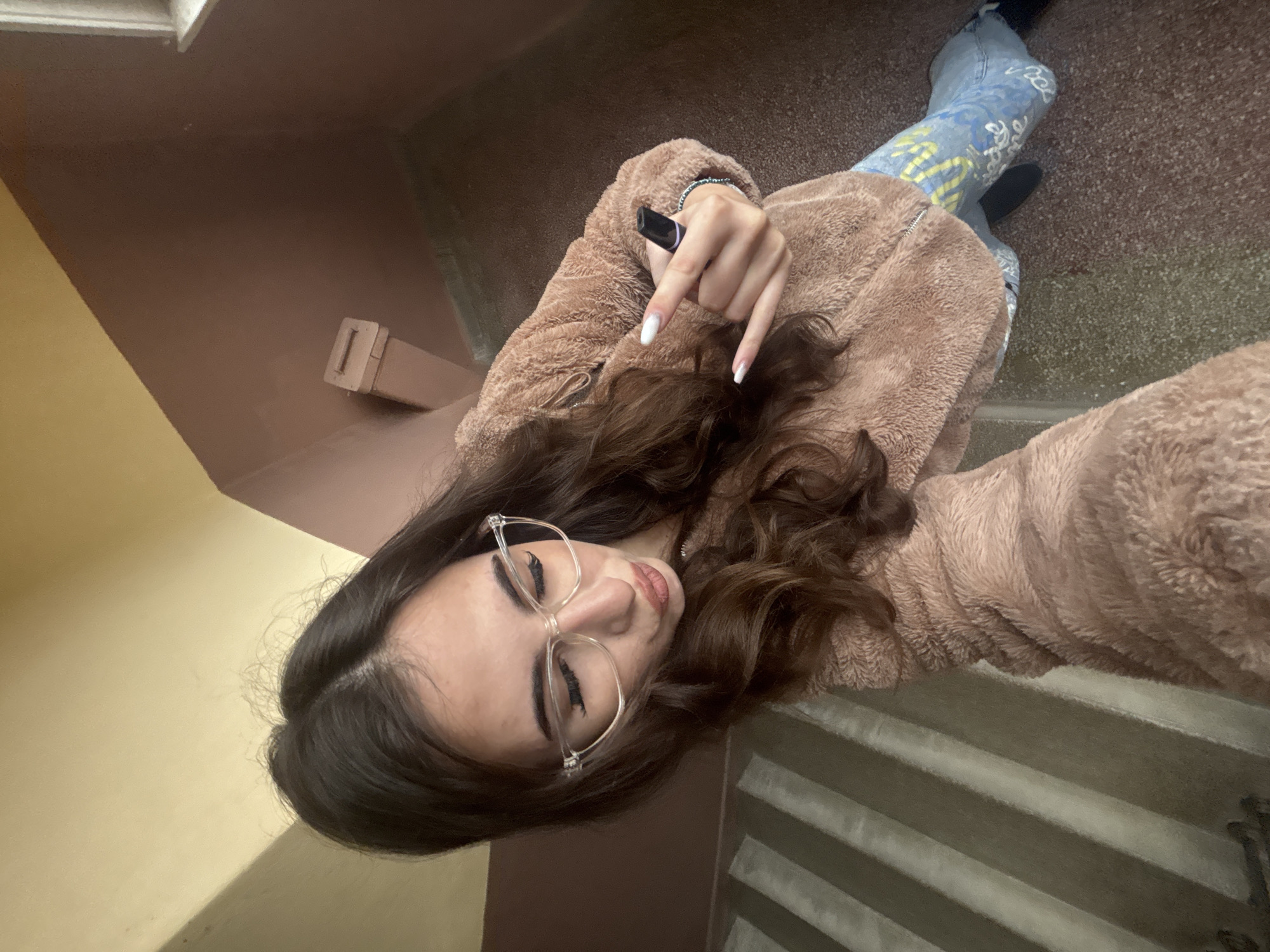A young female, appearing to take a selfie, is positioned in what appears to be an interior building stairwell or hallway. She has long, dark brown wavy hair, wears clear-framed glasses, and has prominent dark eyelashes. Her lips are pursed in a "kiss" expression. She is dressed in a light brown, fluffy zip-up jacket and light blue jeans adorned with yellow and blue graffiti-style text. Her right hand is raised, performing a "rock on" or "shaka" gesture with extended thumb and pinky fingers, while simultaneously holding a dark, cylindrical object, possibly a vape pen, between her thumb and index finger. Her fingernails are manicured with white tips. A beaded bracelet is visible on her right wrist. The background shows a wall section painted light yellow above a diagonal line, and a brown section below it. A brown, rectangular utility box or similar fixture is mounted on the brown wall. To the far right, a segment of a white window frame is visible. On the left side, a section of a staircase with light-colored steps and dark stripes is partially visible. The floor beneath her appears dark and speckled. The environment suggests an older residential or public building interior. There are no identifiable features to specify the location within the city of Yambol, Bulgaria.