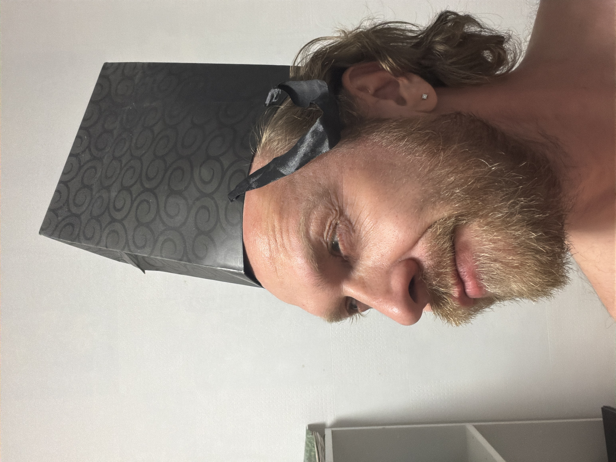 A middle-aged Caucasian male with a reddish-blond beard is wearing a black, patterned paper bag on his head, secured by a black ribbon