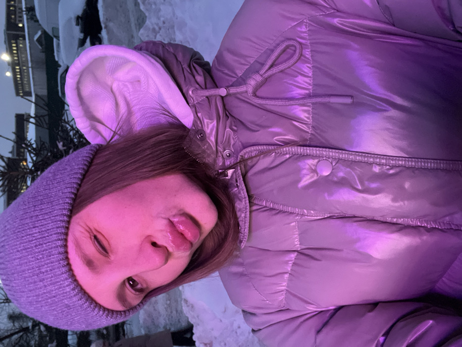 A selfie-style portrait depicts a young female outdoors in a snowy environment within the city of Khimki, Russia. The subject occupies the foreground, looking directly at the camera with her right eye closed in a wink and her lips pursed forward. She wears a light purple knit beanie and a shiny, light purple puffy winter jacket, with a light-colored hoodie visible beneath the jacket's collar. Her face and jacket are illuminated by a prominent purple light source. The background features snow-covered ground. To the left, a snow-laden evergreen tree is visible. Further back and to the right, multiple snow-covered vehicles are parked in what appears to be a lot or street. Beyond the vehicles, a multi-story building with illuminated windows is discernable under an apparent dusk or night sky. A faint, snow-covered form, possibly another individual, is partially visible in the far left background.
