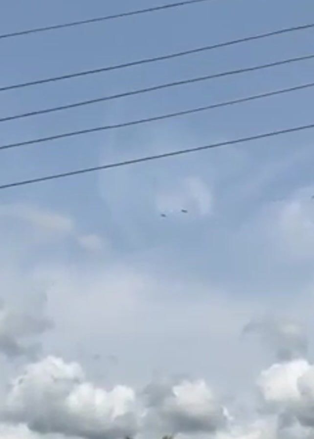 two birds flying in the sky. The sky is partially cloudy, with power lines running across the top of the frame. Palm trees are visible at the bottom of the frame.