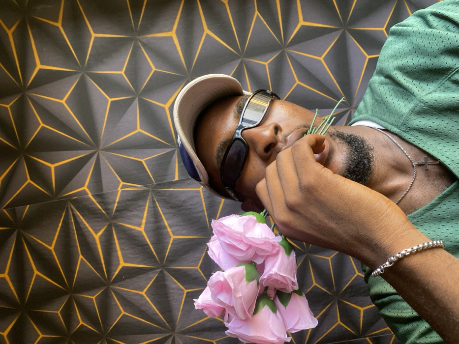 A person wearing a baseball cap and sunglasses is holding pink roses to their face. The person has a silver cross necklace and a bracelet. They are wearing a green jersey. The background is a geometric pattern of dark triangles with yellow lines. The person is tilted at an angle in the frame.