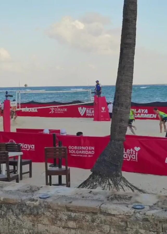 beach volleyball game in progress on a sand court. The court is surrounded by red banners advertising various brands and sponsors. A palm tree is visible on the edge of the court, slightly obscuring the view. Spectators are seated at tables and chairs, watching the game. In the background, the ocean is visible with a boat sailing on the water. The sky is partly cloudy, and a sign with rules or information is displayed near the spectator area.