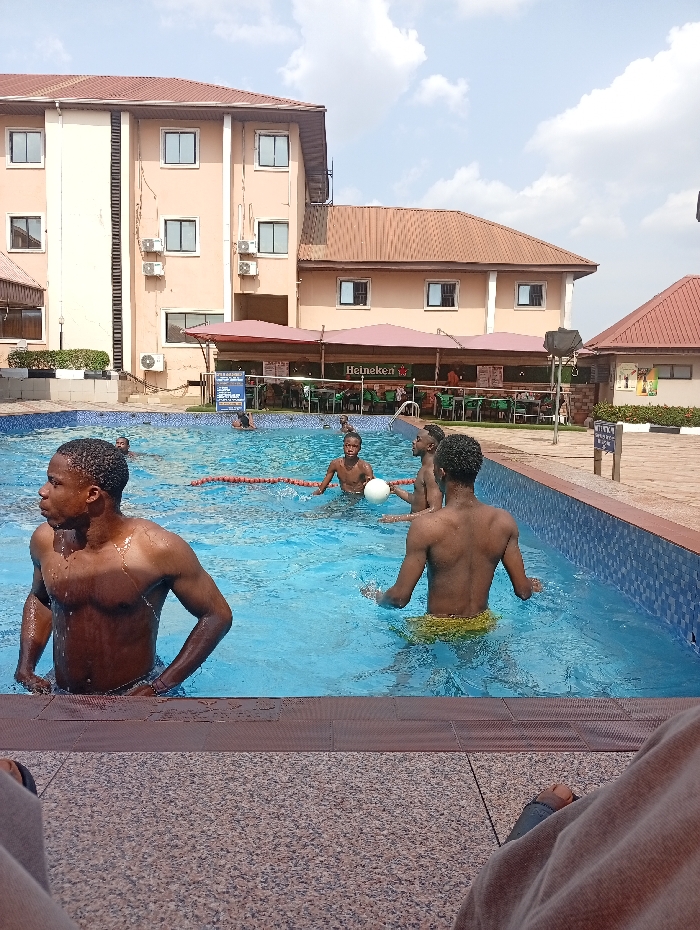 The image presents an outdoor swimming pool scene at a hotel or resort in Onitsha, Nigeria