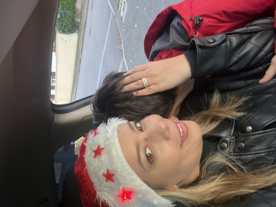 A woman wearing a Santa hat with red stars reclines in a car. Her head is tilted, and she smiles towards the camera. She wears a black leather jacket over a red coat. A man's hand, adorned with rings, rests on his head. The background shows a parking lot and buildings, viewed through the car window. The interior of the car is visible on the left.