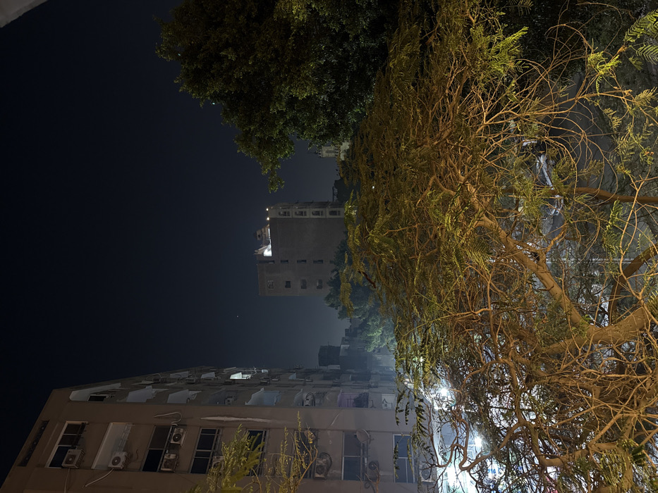 Two buildings rise against a dark, slightly foggy sky. The first building is shorter with multiple windows and air conditioning units, while the second is taller and more shadowed. Trees frame the scene, their branches reaching towards the buildings. One tree is thick and green, obscuring the top of the second building. Another tree with thinner, lighter branches is to the right, illuminated by ground-level lighting.