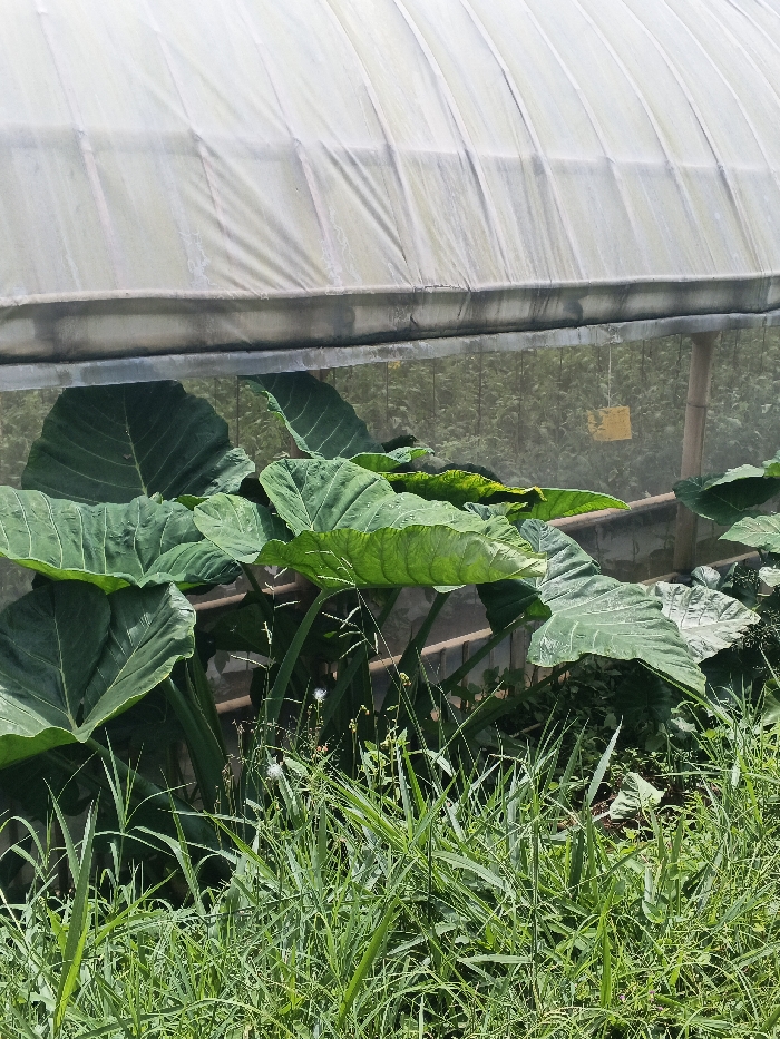 The scene depicts an agricultural setting in ឃុំ ផាត់សណ្ដាយ, Cambodia. The upper portion of a large, arched-roof structure, consistent with a greenhouse or shade house, occupies the background. Its translucent white fabric or plastic covering exhibits weathering and dirt streaks. A horizontal support beam runs beneath the roof's edge. In the mid-ground, a dense cluster of large, dark green, heart-shaped leaves, identifiable as taro or elephant ear plants, grows immediately outside the structure. Behind these leaves and visible through a mesh inside the covered area are rows of smaller green plants. A yellow rectangular sticky trap is suspended within the structure's interior. The foreground consists of various species of wild green grasses and weeds, some displaying small white seed heads, covering the ground. No individuals are present.