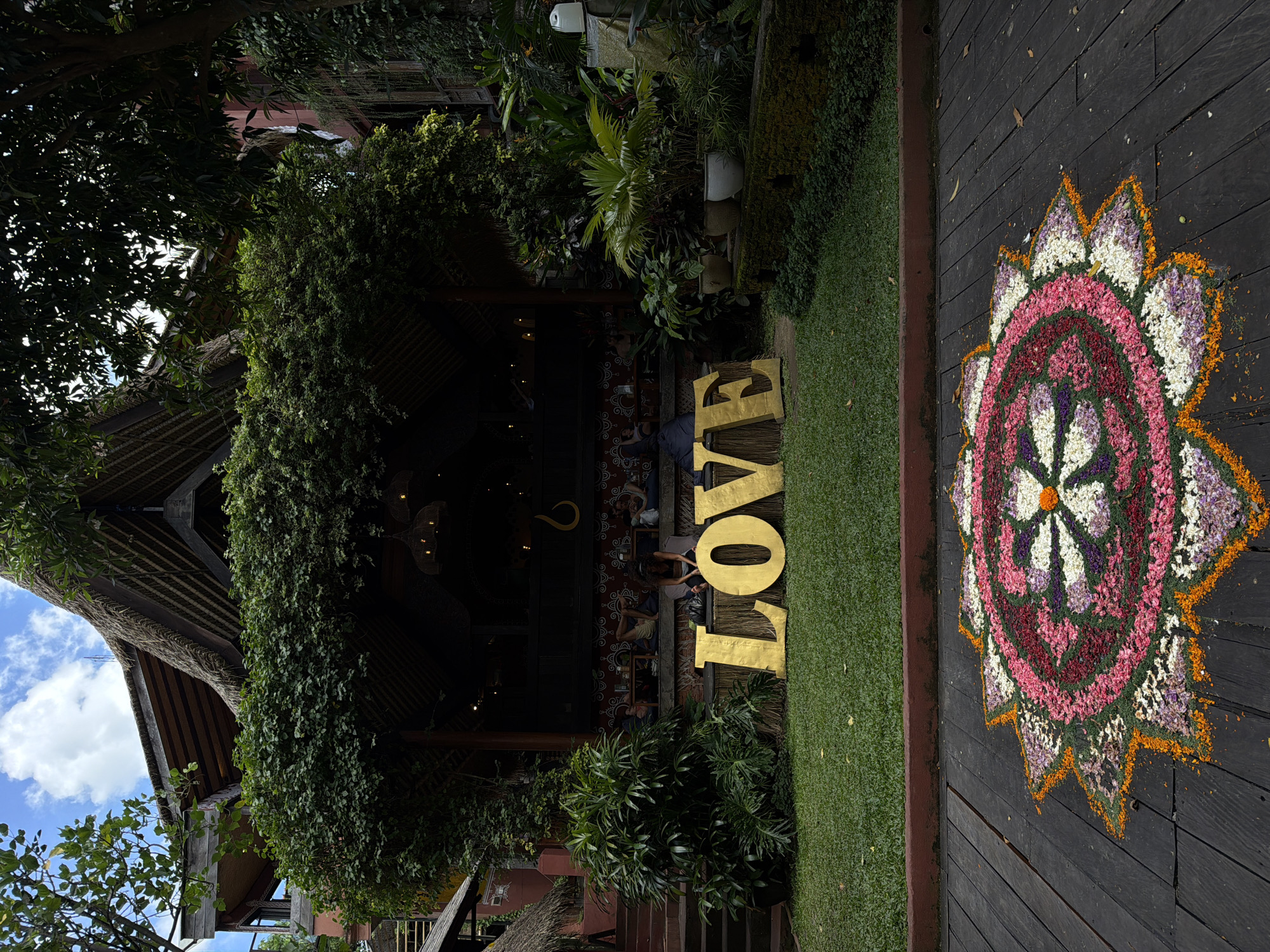 n outdoor scene in Peliatan, Indonesia, featuring decorative elements associated with a local establishment. In the foreground, on a dark wooden plank surface, is a large, circular floral arrangement with multiple concentric rings of colorful petals (white, pink, red, purple, and orange) forming a star-like pattern. Adjacent to the floral design, on a strip of grass, is the word "LOVE" spelled out in large gold-colored letters. Behind the word "LOVE", a vine-covered structure suggests the entrance to a restaurant or similar establishment. The interior of the building is dimly lit, making details difficult to discern, but there appear to be people seated inside. Additional greenery and trees surround the building, with a partial view of the building's thatched roof and the sky visible in the upper left corner of the image.
