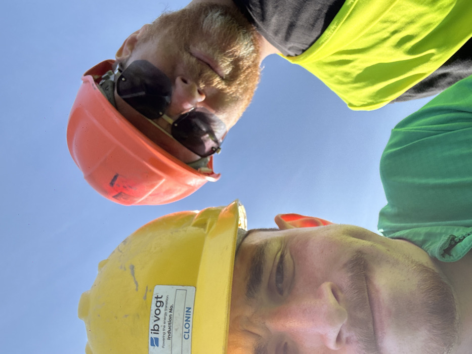 Two male individuals are depicted in a low-angle photograph taken outdoors in Ballinvalley Lower, Ireland, against a clear blue sky. The individual on the left has visible stubble/short beard, wears a green collared shirt, and a yellow hard hat. The hard hat bears a sticker with "ib vogt" logo, the text "Powering the energy transition," "Induction No.," and "CLONIN." The individual on the right has a reddish-brown beard, wears dark sunglasses, an orange hard hat, a black shirt, and a neon yellow/green high-visibility vest. Both individuals are looking towards the camera.