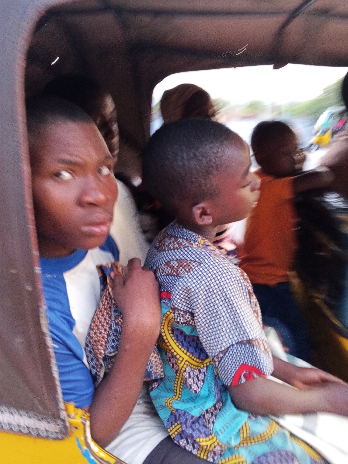 Inside a motorized rickshaw, multiple people are crammed together. A young man in a blue and white shirt peers out the opening. Beside him, a smaller child in a patterned blue and white shirt looks out the window. Behind them, another child is visible wearing an orange shirt. The rickshaw's yellow trim is visible at the edge of the opening, and motion blur suggests the vehicle is in transit.