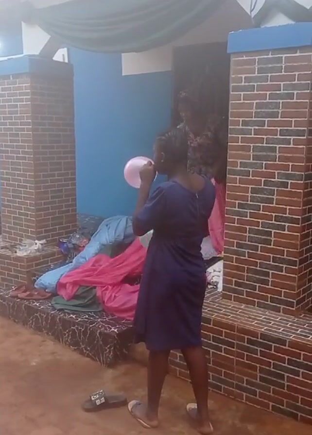A woman wearing a blue dress blows up balloons outdoors in front of a decorated entryway. The entryway has two brick pillars, a light blue wall, and draped fabric above. There are several balloons in her hands after she blows them up. Her shoes are resting on the ground beside her feet. In the background, more balloons and draped fabric can be seen inside the entryway. There is a sound of music playing.