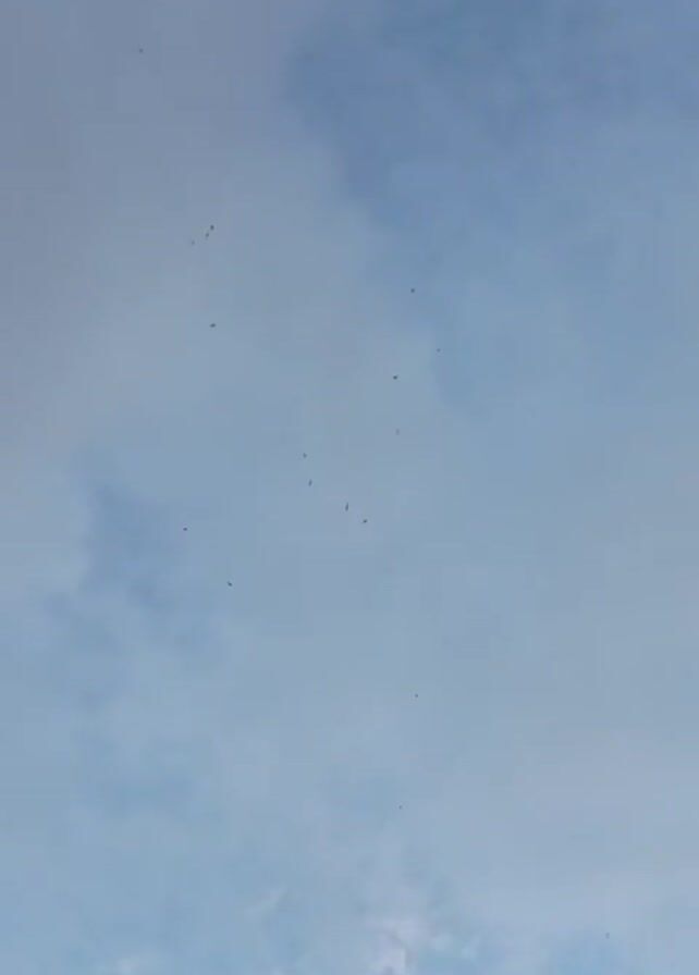 daytime sky with scattered clouds. Several small, dark objects that appear to be birds are flying in the sky. The sky transitions from lighter blue to gray as the video progresses, with darker, more prominent clouds appearing toward the end. There are no people or other objects visible besides the sky, clouds, and birds.