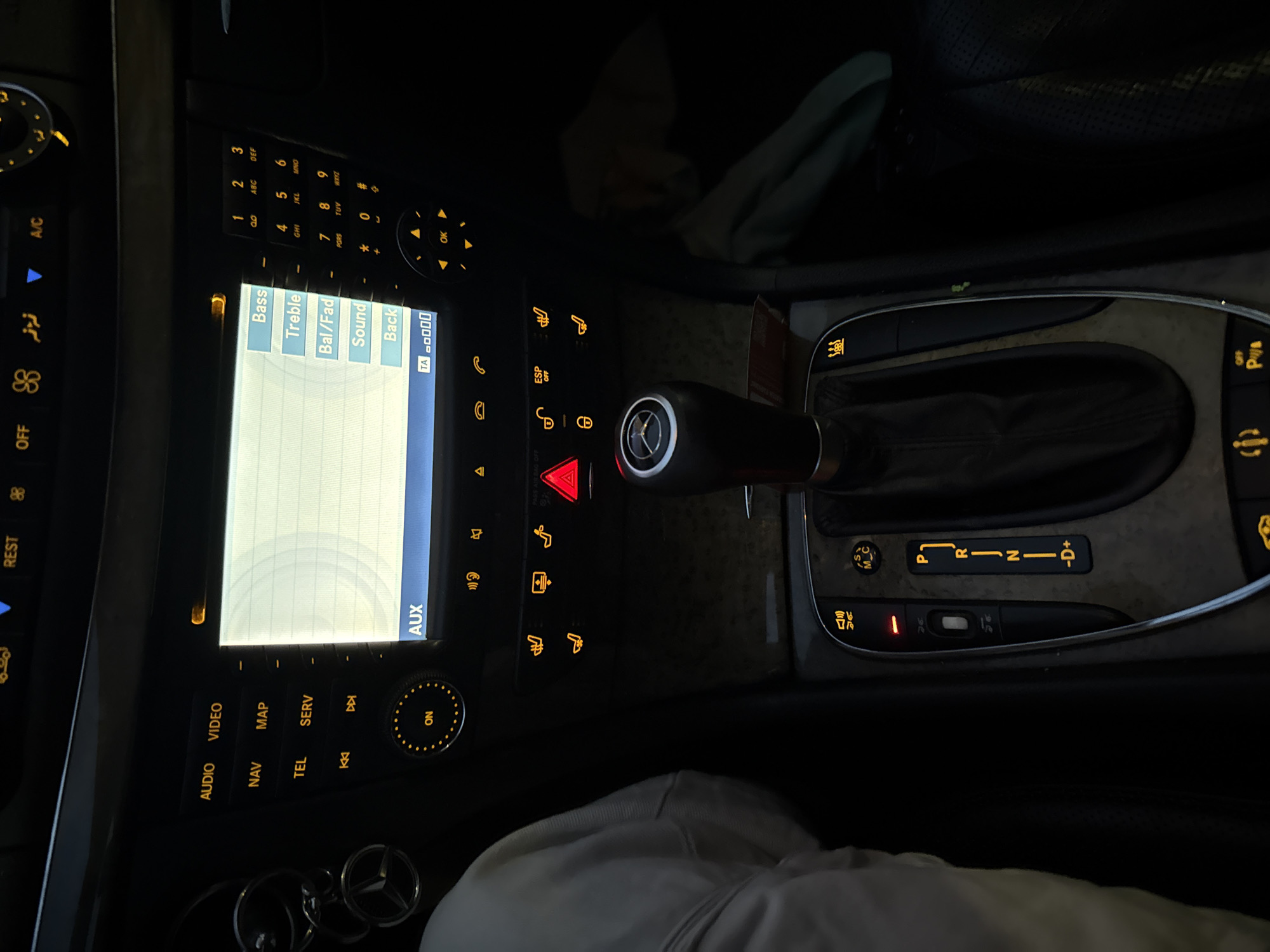 interior of a Mercedes-Benz car, specifically the center console and dashboard area. The car's infotainment screen is illuminated, displaying audio settings such as "Bass," "Treble," "Bal/Fad," "Sound," and "Back." Buttons below the screen are labeled "AUDIO," "VIDEO," "NAV," "MAP," "TEL," and "SERV." A circular knob labeled "ON" is also visible. The gear selector is in the "P" (Park) position. Other features visible include the hazard light button, seat heating controls, ESP off button, and various other controls. The image seems to be taken indoors, with the environment relatively dark. There is no information to indicate the location as Sofia, Bulgaria.