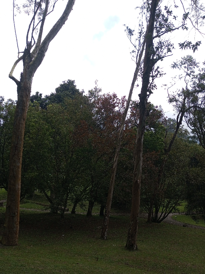 The scene depicts an outdoor arboreal environment in New Serchhip, India, under an overcast sky. The foreground is dominated by green grass and three prominent tree trunks with light-colored bark; one is positioned on the far left, and two thinner, taller trunks are centrally located to the right, with one leaning. The ground shows areas of shade. The midground features a dense collection of trees and shrubs with varying shades of green foliage, interspersed with some reddish-brown leaves. A faint, unpaved path or cleared area is visible among the trees in the lower midground. The background consists of more dense tree cover extending towards a largely white, overcast sky. No individuals, explicit actions, or interactions are visible.