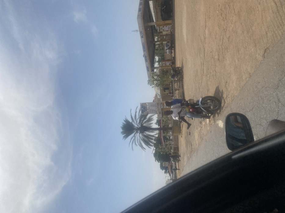 The image displays an outdoor street scene in Karshi, Nigeria, under a bright, mostly clear sky with sparse cirrus clouds. The perspective is from inside a vehicle, with a black car door frame and side mirror partially visible on the left, reflecting a person's legs. In the foreground, on a paved road with an unpaved dirt shoulder to its right, two men are seated on a red and silver motorcycle. The front rider, wearing a white shirt and dark trousers, has his left leg extended. A second man, in a blue shirt, is a passenger behind him. Directly right of the motorcycle and dirt shoulder is a gas station with a canopy, displaying signage that reads "NUREMA GENERAL RESOURCES LTD." A prominent palm tree stands centrally behind the motorcycle, and a sign beneath it reads "WELCOME TO KARSHI" with additional text below. Several other individuals are visible walking or standing further down the road to the left, and near the gas station, where other motorcycles are also parked. A white van is discernible in the distant left.