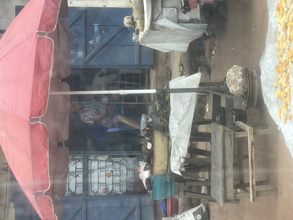 An outdoor market scene in Urualla, Nigeria, is depicted under a large red umbrella with white trim