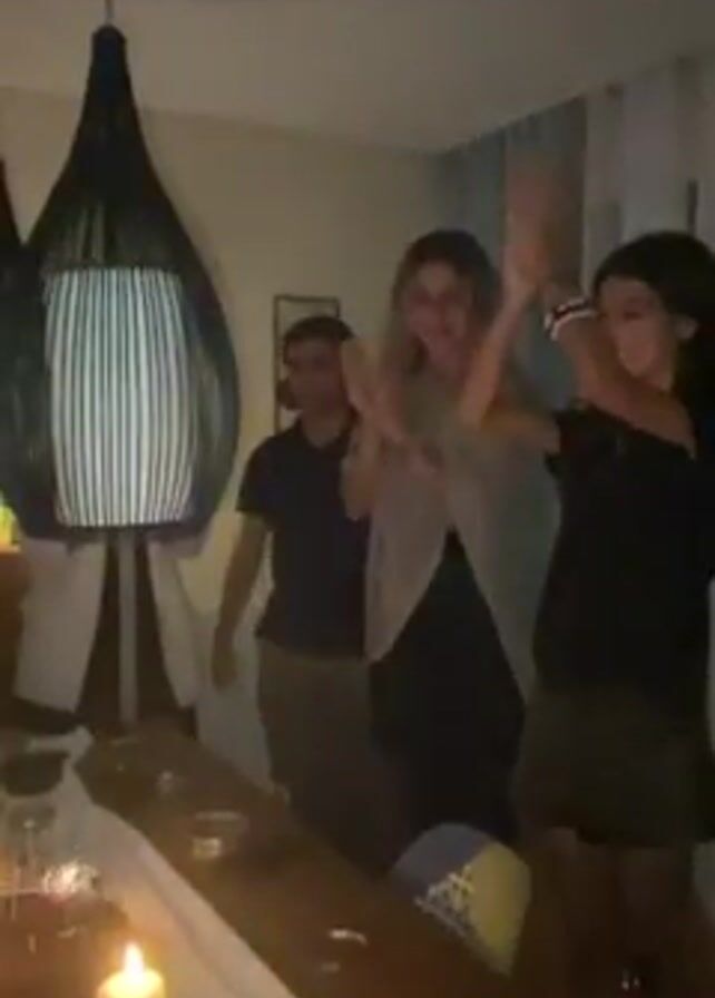 three people in a room, possibly celebrating or cheering. A man is standing in the background clapping. Two women stand closer to the camera, also clapping enthusiastically with their arms raised. The room is dimly lit, with a long wooden table in the foreground. The table is decorated with candles and what appears to be place settings. A large, woven lamp hangs to the left. A bottle is visible on the table. A curtain is behind the group, and artwork is visible on the wall.