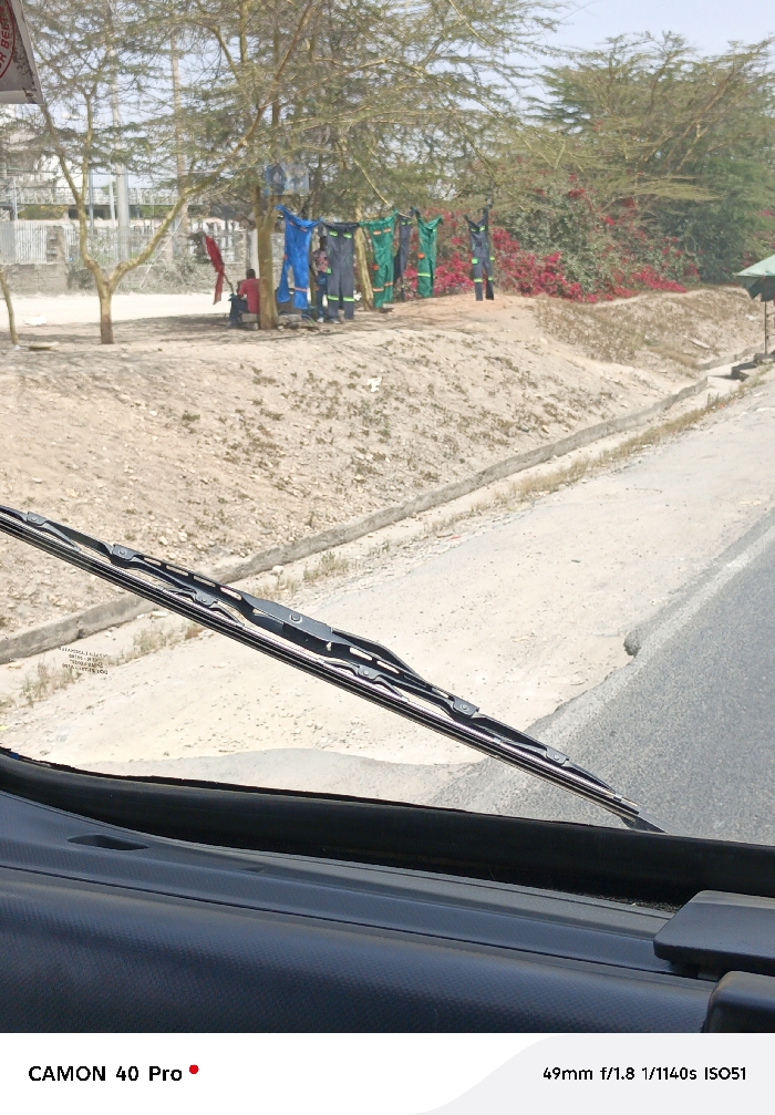 A medium shot captured from inside a vehicle with a windshield wiper prominently in view. Outside the car, clothes hang from a line between trees. A person is seated nearby, possibly a tailor or laundromat worker. Red flowers bloom amidst the green foliage. The background is a mix of buildings and more trees under a bright sky. The road is visible, indicating the vehicle is in motion.