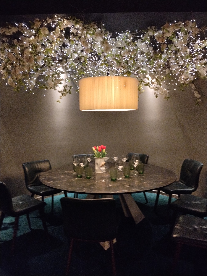 A dimly lit dining room features a round table with dark marble top. Place settings include clear wine glasses and green tumblers. A small vase of red tulips sits in the center. Black leather chairs surround the table, one with an accompanying ottoman. Above the table, a cylindrical lampshade emits a soft glow, illuminating the setting. A sprawling arrangement of white flowers and twinkling fairy lights adorns the wall and ceiling behind the table.
