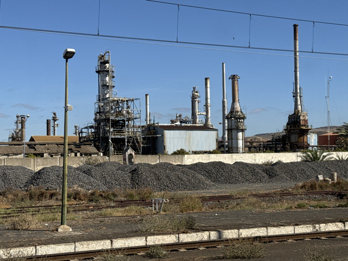 The image displays an industrial complex, identified as being in the city of Sidi Kacem, Morocco, under a clear, bright blue sky. In the foreground, multiple railway tracks run horizontally across dry earth interspersed with sparse vegetation, bordered by a white-painted concrete platform edge at the bottom. A tall, grey streetlamp, equipped with a rectangular light fixture and a small white cylindrical device, stands prominently in the left-center. Behind the tracks and the streetlamp, large, dark grey piles of granular material are stacked in irregular mounds, fronting a low, light-colored concrete wall. The background reveals an extensive industrial facility, characterized by numerous tall distillation columns, smokestacks, and intricate networks of pipes and structural frameworks, indicative of a refinery. Visible structures include a large, light blue corrugated metal building, older industrial buildings with weathered brown roofs, and a reddish cylindrical tank on the right. Sparse palm trees are visible on the far right, with arid hills in the distant background. No people or active processes are visible in the scene.