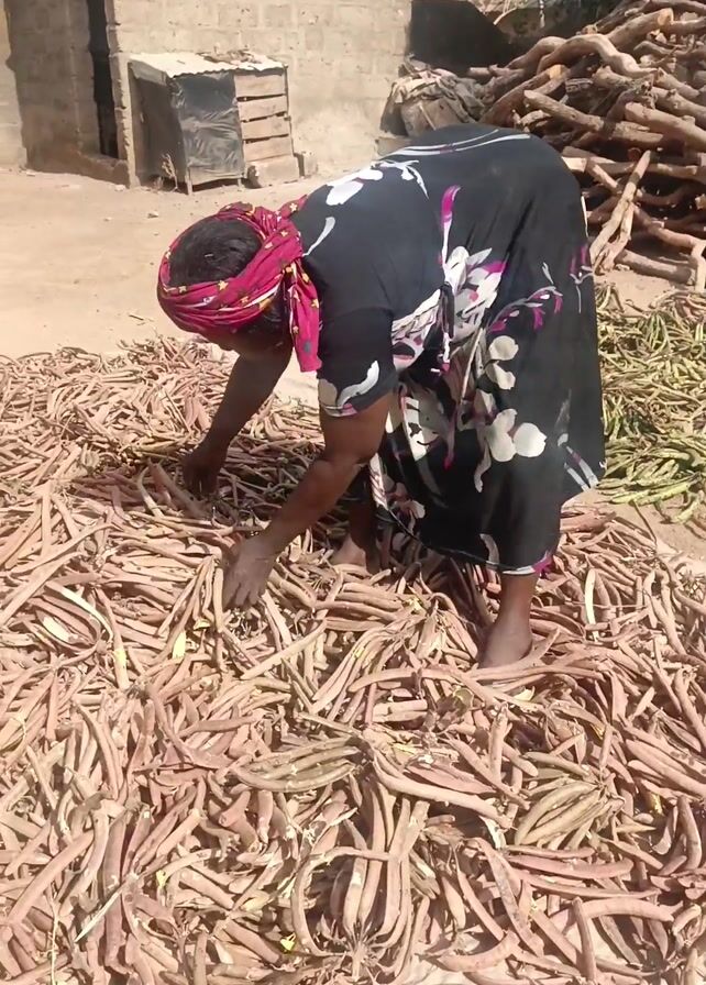 A woman is standing barefoot, sorting through a large pile of dried beans. She is wearing a long, dark dress with floral print and a red headscarf. The beans are laid out on a sheet on the ground. Behind her, there is a pile of firewood, a small shed-like structure, and a partially visible building. Some green beans are also visible near the firewood. The scene appears to be taking place outdoors in a rural setting, on a sunny day.