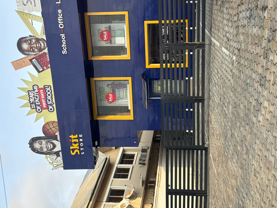 A blue and yellow storefront displays "Skit Store" alongside a sign promoting "25 years of exciting first days of school," with images of students and school supplies. The storefront has windows with "Back to School SALE" stickers visible. A grey gate stands in front of the building, leading to a paved area. The top of another building is visible behind the store, adding context to the urban setting.