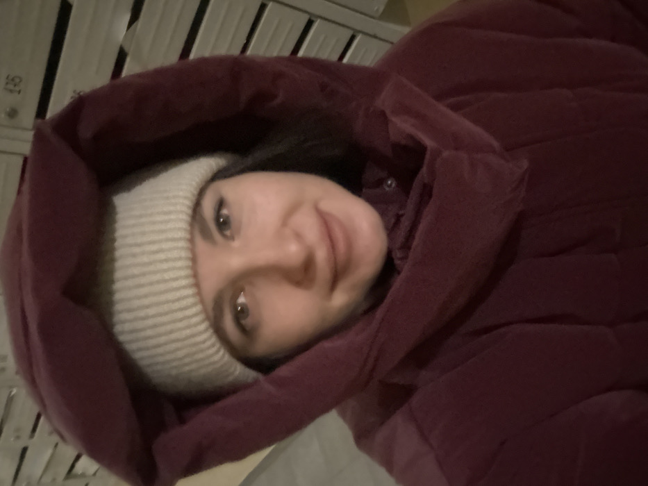 A female individual is depicted in a close-up, head-and-shoulders photograph, taken at an upward angle in Akulovo (Gp Kubinka), Russia. The subject possesses dark hair, light-colored eyes, and fair skin, with a slight smile evident on her lips. She is dressed in an off-white ribbed knit beanie and a dark red/maroon hooded puffer jacket, with the hood up, framing her face. A silver snap button is visible on the jacket's front closure. The background consists of a wall featuring multiple stacked, light-colored compartment units, resembling mailboxes or lockers. One upper unit is marked with the number "435," and other numerical designations are partially visible on adjacent units.