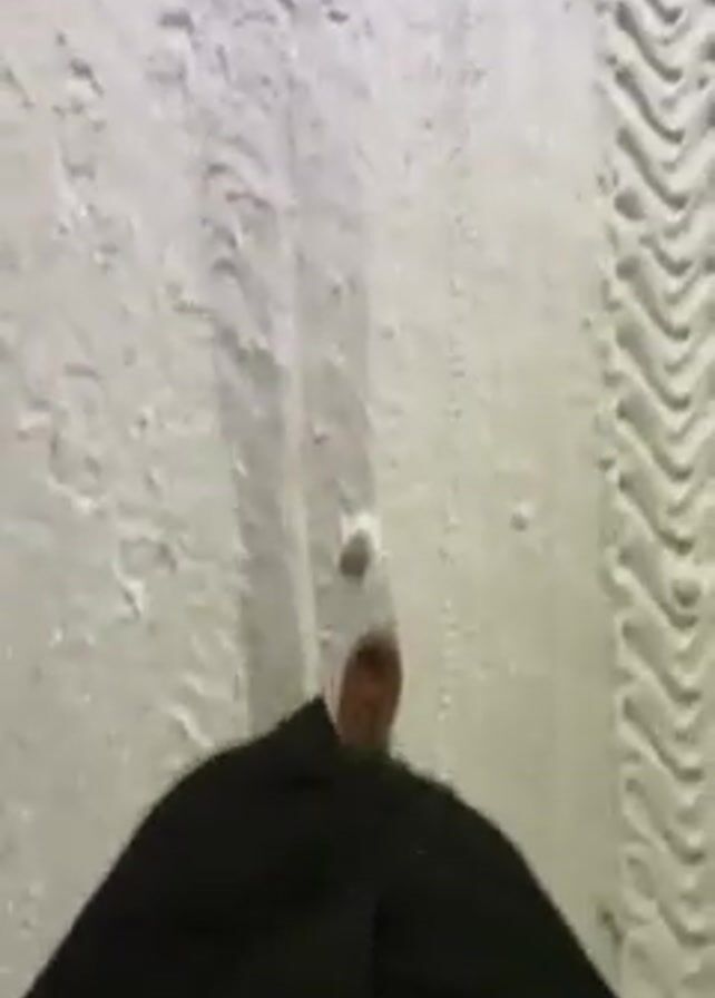 person's view while walking on a snow-covered surface. The person is wearing brown boots, dark pants, and a dark coat. A tire track is visible on the right side of the frame. The snow is packed and uneven. The person's shadow is visible on the snow.