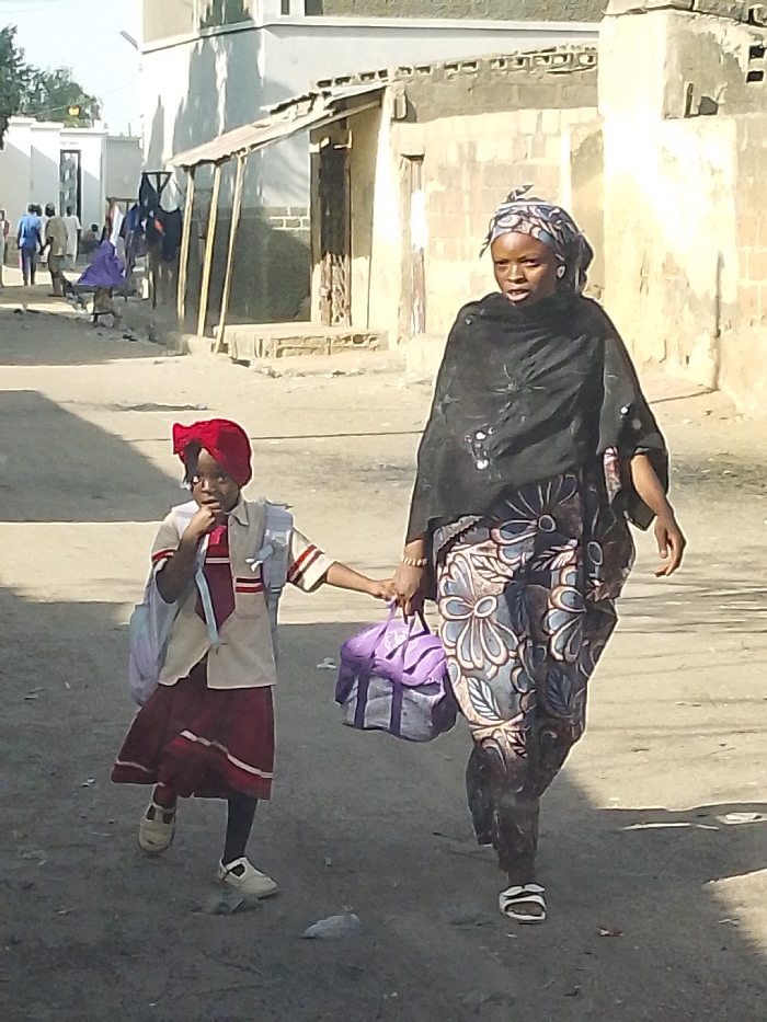 A woman in a patterned headscarf, black shawl, and floral pants walks hand-in-hand with a child wearing a red head covering and school uniform consisting of a red and white dress, backpack, and sandals. The woman carries a purple bag. They walk on a dirt road in what appears to be a village or neighborhood with buildings and other people in the background. The scene is brightly lit, suggesting it is daytime.