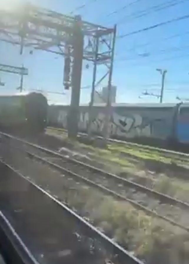 The view from a moving train shows train tracks, overhead wires, and other train cars on an adjacent track