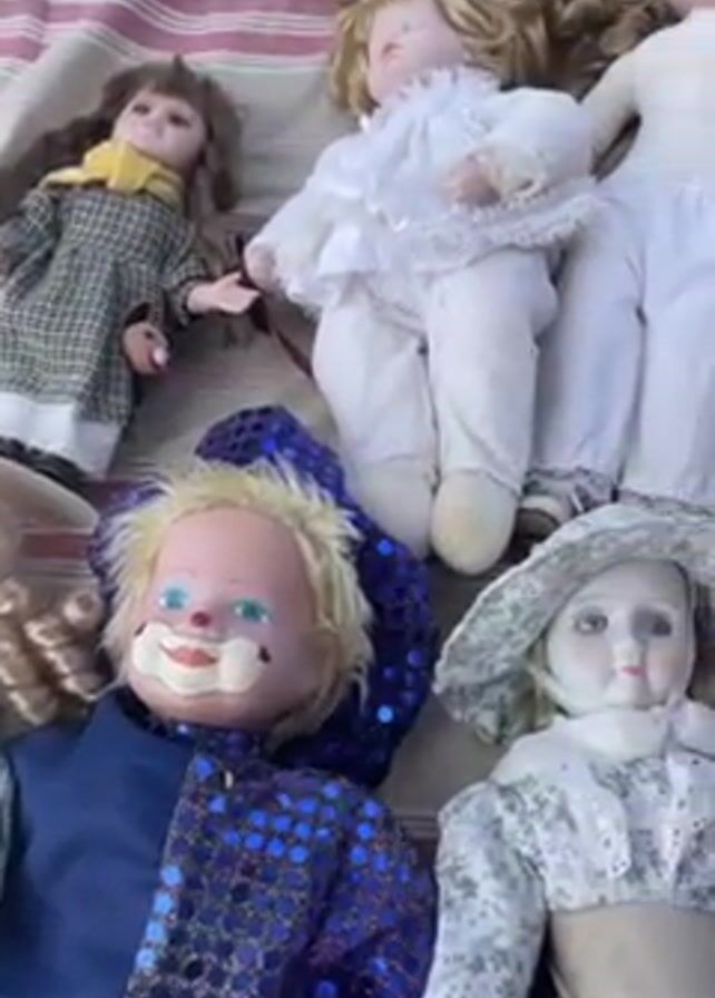 collection of dolls laying on a striped cloth. There are approximately 20 dolls, mostly porcelain or ceramic with cloth bodies. Their clothing varies from white dresses and pajamas to flowered frocks and one clown suit. The camera pans across the group of dolls. There are no other people present in the video.