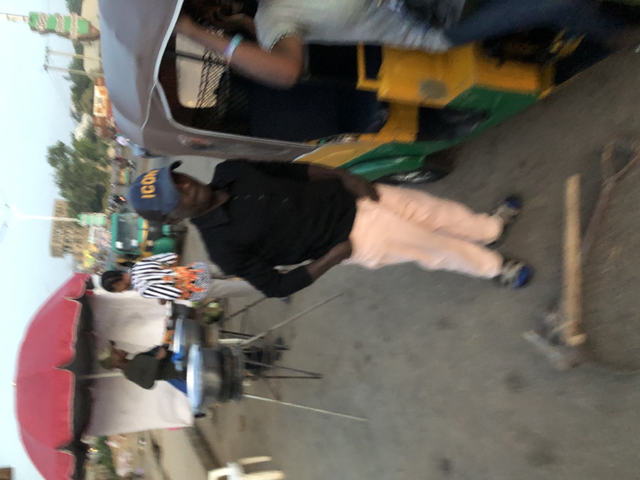 This image portrays an active street scene in Kabong, Nigeria, featuring a street food stall and individuals. In the immediate foreground, a man wearing a black long-sleeved shirt, light peach trousers, and a blue baseball cap with "ICON" in yellow letters stands facing left, with his hands in his pockets. His face is slightly blurred. To his right, a green and yellow auto-rickshaw (keke-napep) is parked, with a person's partially visible arm and torso near its entrance. On the asphalt ground directly in front of the man, a hoe with a light wooden handle and additional wooden debris are present. In the mid-ground on the left, a street food stall is set up under a large red umbrella with white side panels. A vendor in dark clothing stands behind two large, dark cooking pots resting on metal tripod stands, appearing to be engaged in food preparation or serving. Another individual, wearing a distinctive black, white, and orange/brown striped shirt, stands facing the vendor. The background is blurred, showing a street with other auto-rickshaws, indistinct buildings, and utility poles beneath an overcast or twilight sky.