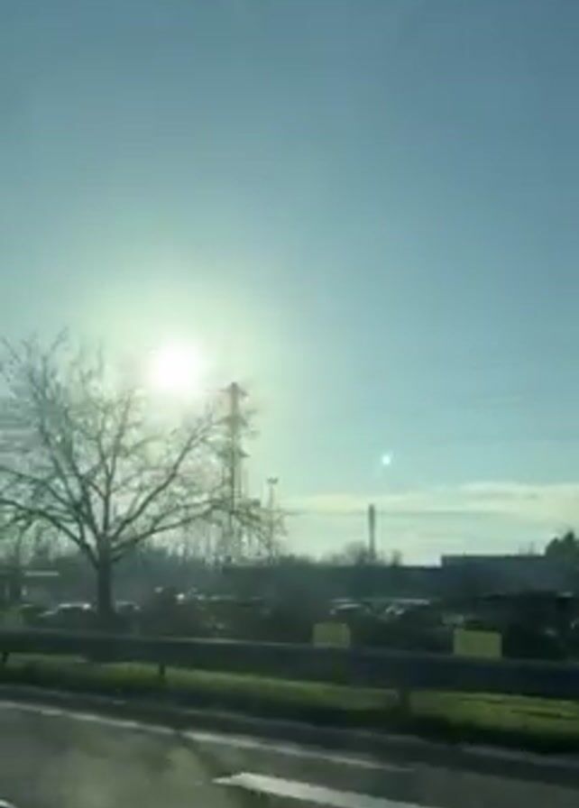 view from a car driving on a highway, with the sun shining brightly in the sky